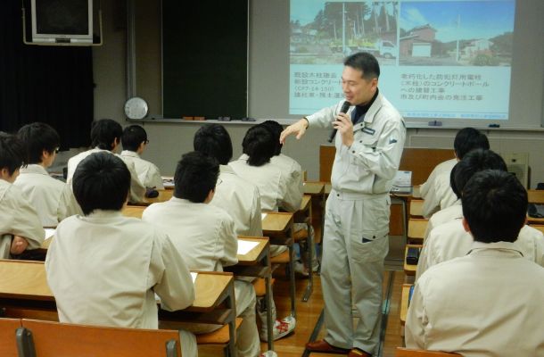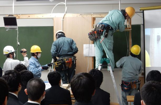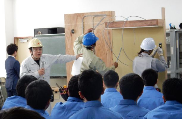 電気工事業は、社会インフラの整備を担う重要な役割がありますが、仕事の内容が外部から見えにくい一面があります。また、電気工事業界では後継者不足、技能継承が喫緊の課題となっており、電気保安確保の観点から国民生活の安心安全に貢献できる優秀な人材を育成しなければなりません。そこで、次代を担う高校生の方々に電気工事業界について知っていただき理解していただく場として、また、就職活動において地元企業も選択肢の一つとしていただく機会となることを願い、平成26年度より県内の主に電気系工業高校において交流事業(出前授業)を開催し、平成30年度からは電気系ではない高校にも拡大いたしました。