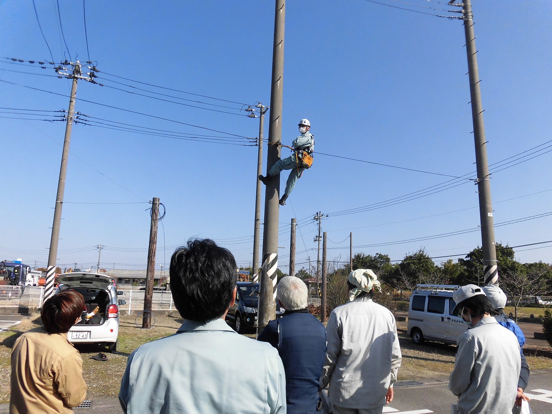 説明会とは別に、フルハーネス型安全帯使用時の昇降柱はどうすればいいのか、現時点での方法の説明と実技を中野支部技術委員長より行っていただきました。