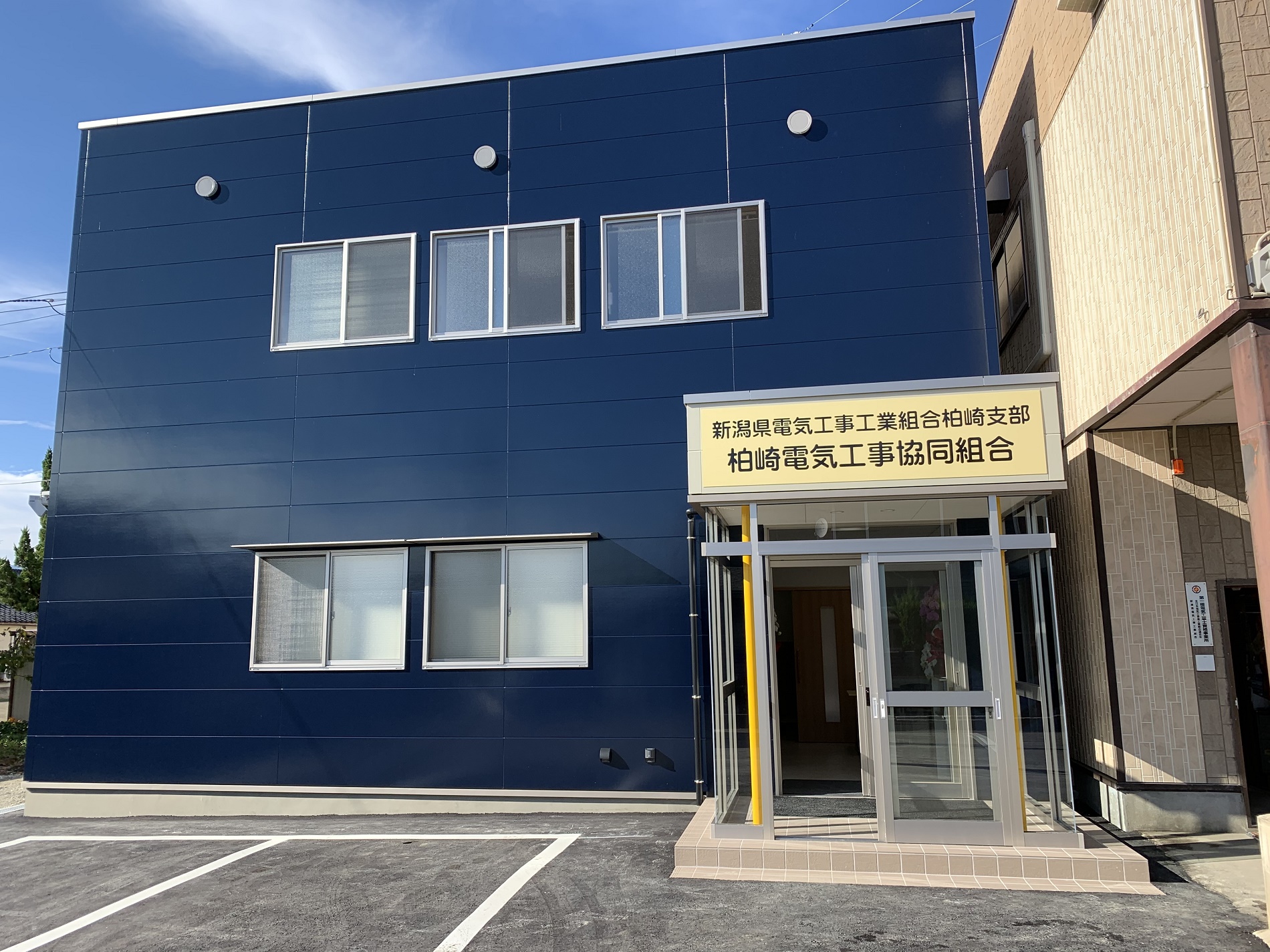 去る11月12日組合新建屋が完成、19日に小規模ながら、組合理事、担当委員と、ご来賓に電力柏崎営業所 瓶子所長、柏崎電力センター 白岩所長、県本部より小林理事長 様と他工事関係者、電設資材店の方々より出席いただき、竣工式を執り行いました。