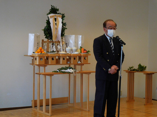 最初に、新潟県電気工事工業組合新潟支部 斎藤支部長より新年のご挨拶があり、玉串奉奠を斎藤支部長、続いて、渡邉副支部長、森山副支部長、星副支部長、次に、総務経営委員会・渡辺委員長、技術委員会・田中委員長、引込線関連委員会・長浜委員長、青年部・井上会長の順におこないました。