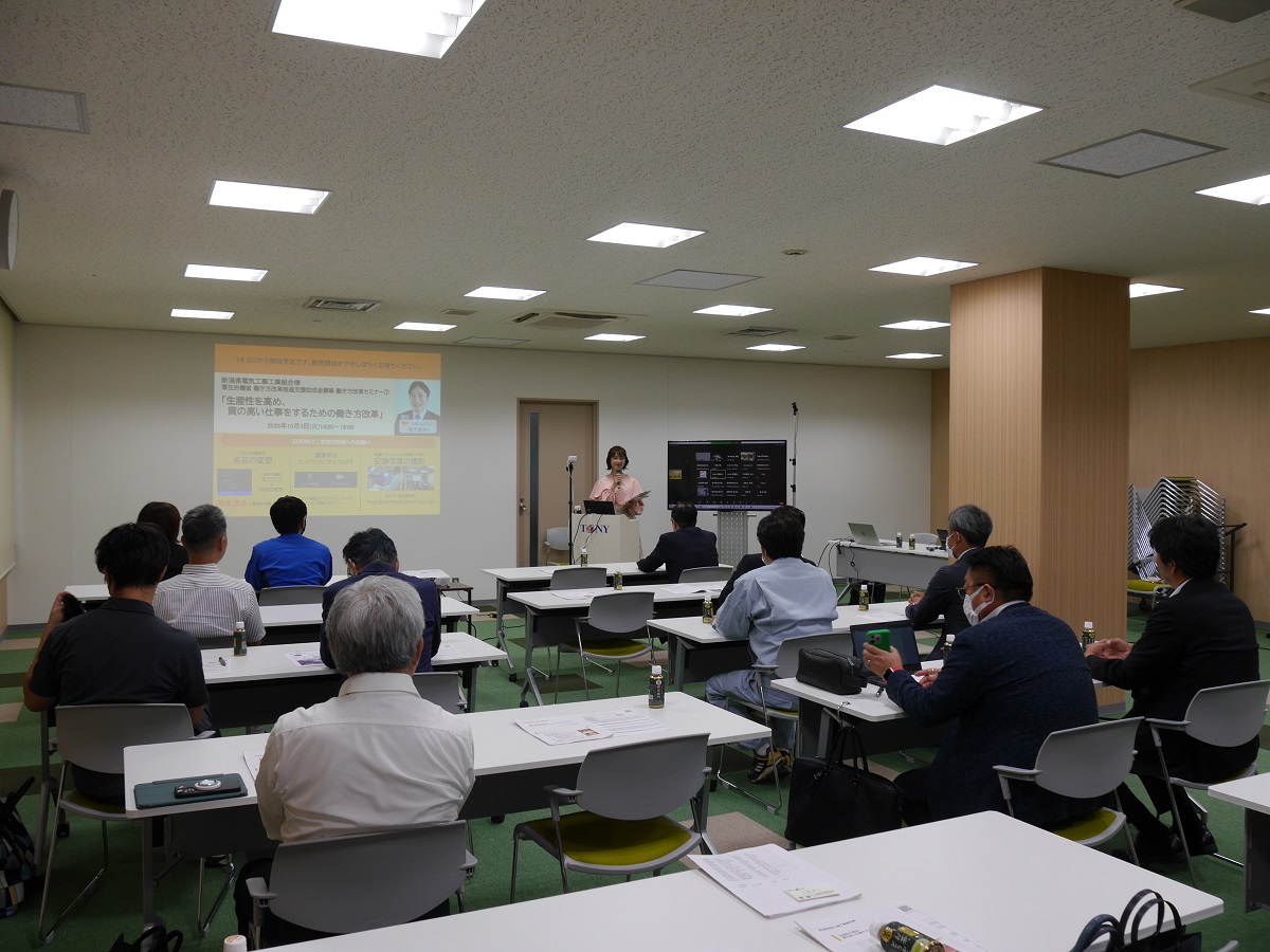 建設業の2024年問題が目前に迫っている中、このたび電気工事組合では、将来的な「業務改善」「人材確保」「労働条件改善」に向けたセミナーを、TeNYテレビ新潟様の会議室にて、ハイブリッド開催いたしました。