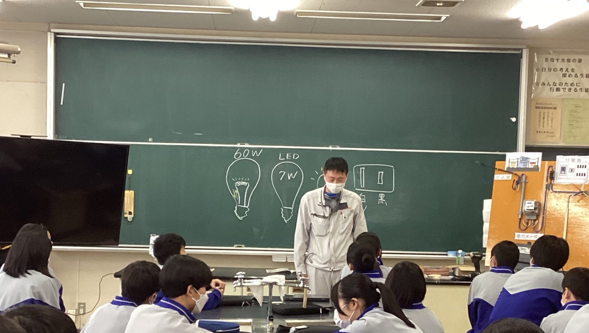 講義は模擬盤を使用し、家の中の電気の配線や仕組みについての説明を行い、電気工事士の資格や仕事内容、やりがいについてお話をさせていただきました。