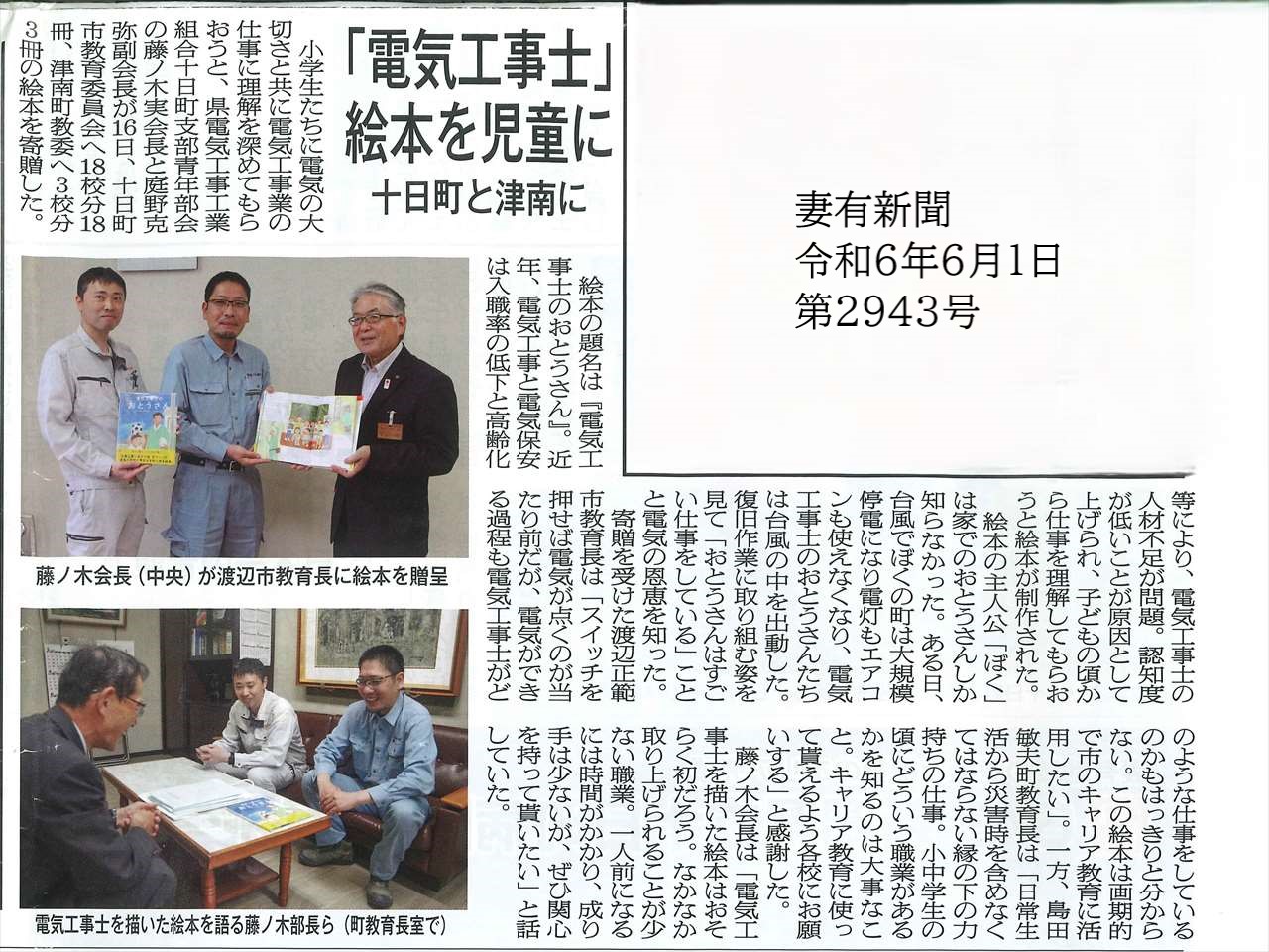 2024.07.26 活動報告【2024年度】 青年部 十日町支部 十日町支部活動報告 十日町支部青年部では5月16日に 十日町市と津南町の小学校計21校に 絵本「電気工事士のおとうさん」を寄贈しました。 絵本を通して子どもたちに電気の大切さ、 地域の安心・安全の為に働く電気工事士の仕事を 知ってもらう機会になればと思います。