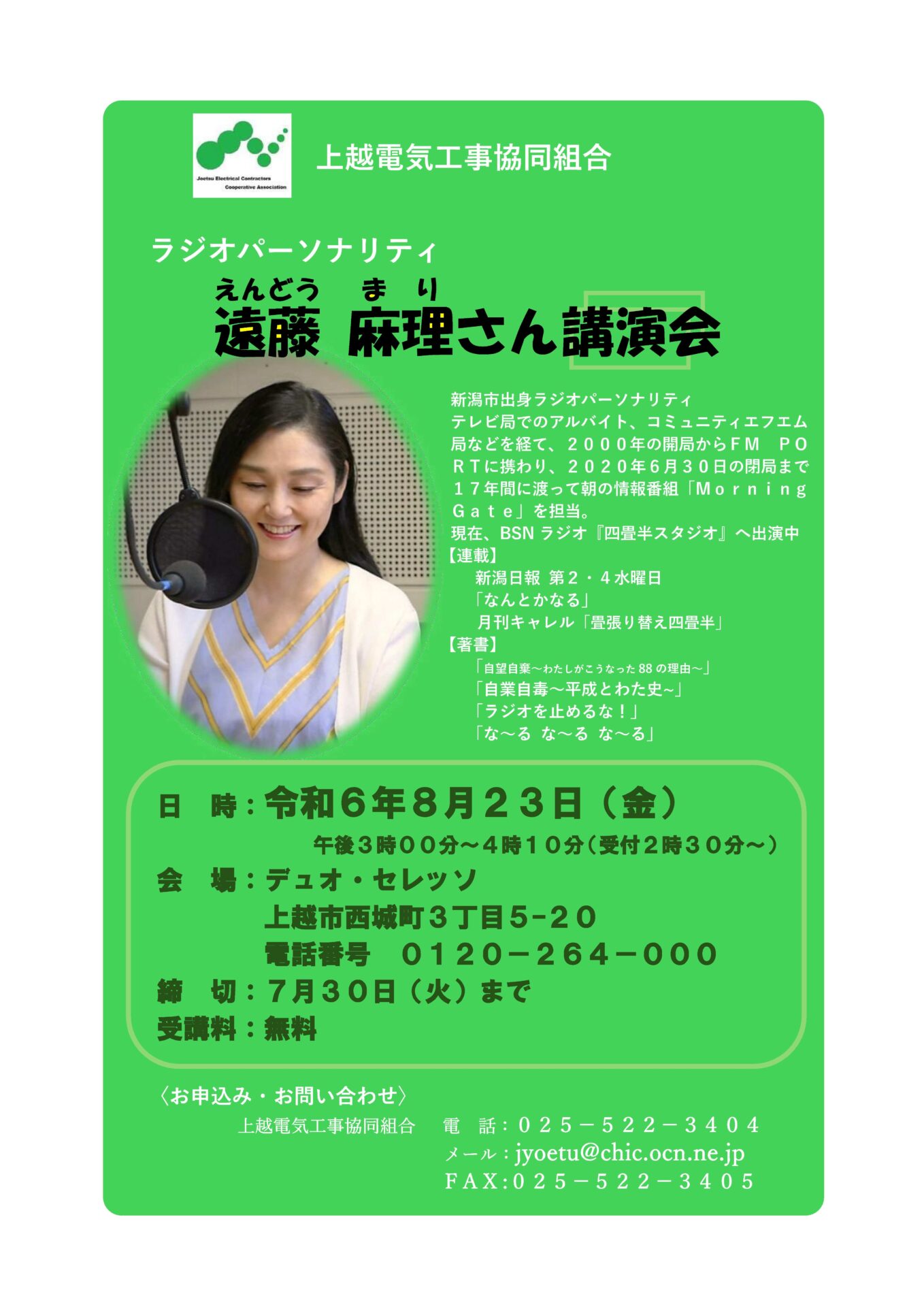 2024.07.26 上越支部 遠藤麻理さん講演会のお知らせ 令和6年8月23日(金)に組合員交流会を開催いたします。 その中で、遠藤麻理さん講演会を予定しています。 遠藤麻理さんの講演会はどなたでもお申込みできますので 組合員以外の皆さまも、お気軽にお問い合わせください。